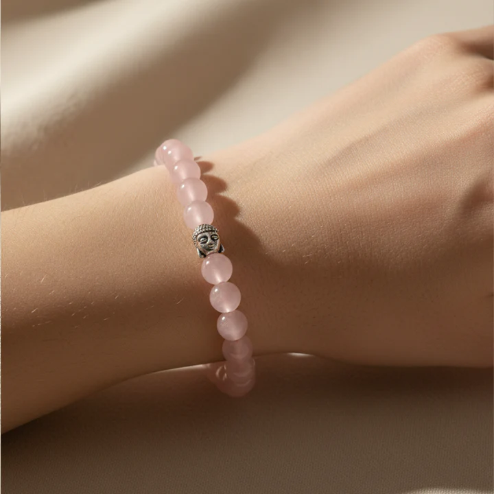 The Rose Quartz Bracelet with Buddha Head is crafted using natural rose quartz beads known for their soft pink tone and gentle appearance. The smooth 8 mm beads give the bracelet a clean and soothing look, while the Buddha head charm adds a peaceful and meaningful touch.